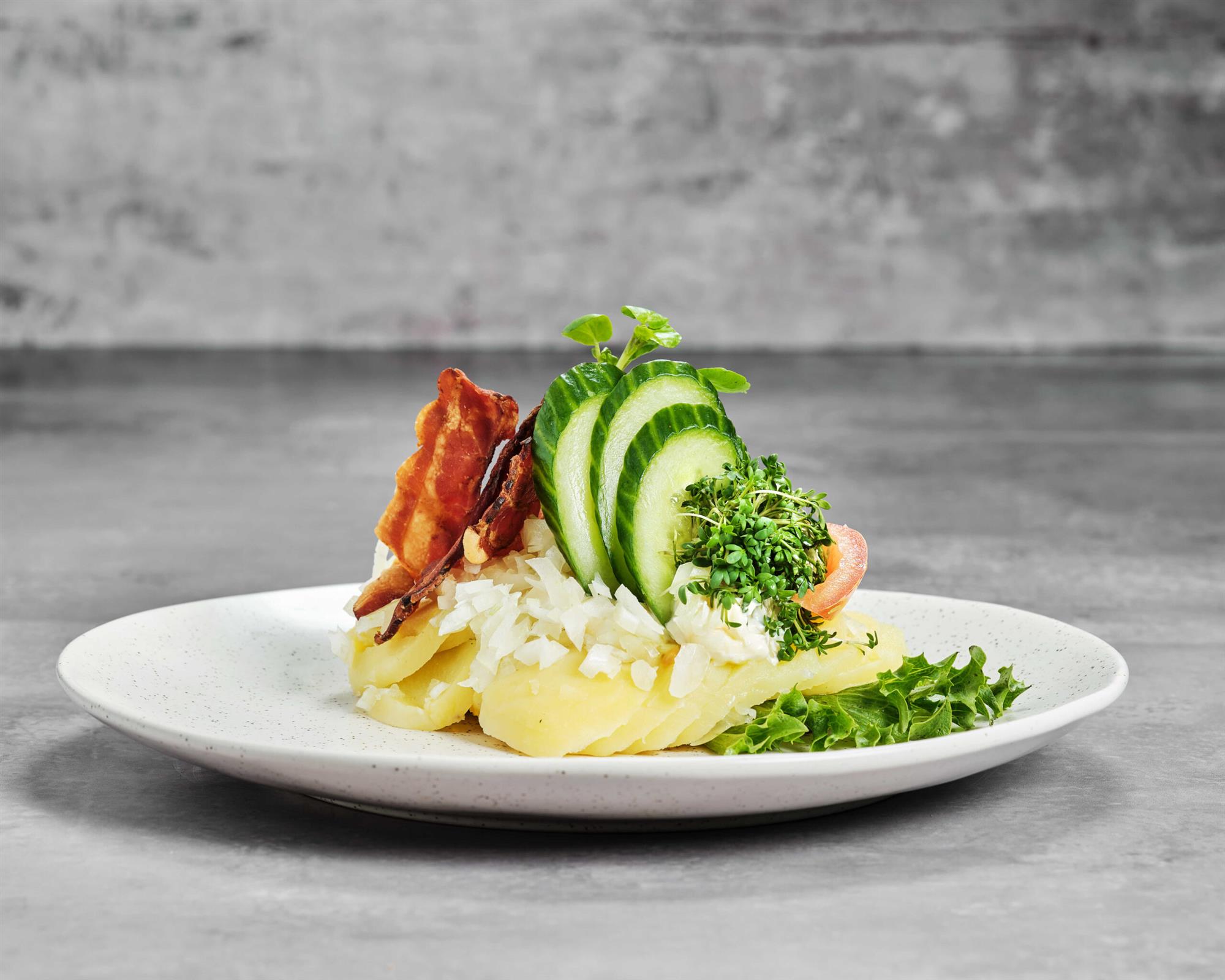KARTOFFEL MED MAYO, RÅ LØG, OG BACON